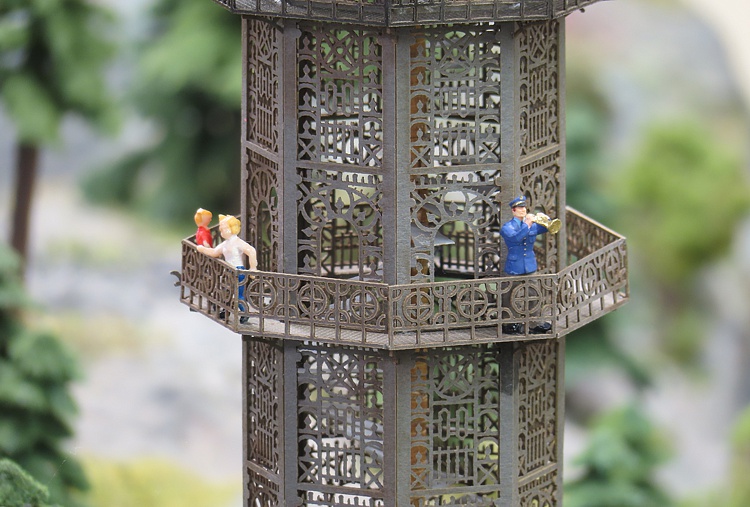 Unter dem Begriff "Aussichtsturm Löbau" bietet die tschechische Firma BuBiModel s.r.o. diesen Aussichtsturm als Laser-Cut-Bausatz an. Der Turm ist in freier Anlehnung an den weithin bekannten Aussichtsturm aus Gusseisen auf dem Löbauer Berg gestaltet. Mit der Idee und dem beschwerlichen Aufbau des filigranen Baustzes konnte sich Rainer May sicher ein "Bienchen" bei den Besuchern oder gar ein Trompetenständchen von den "Löbauer Bergmusikanten" verdienen.